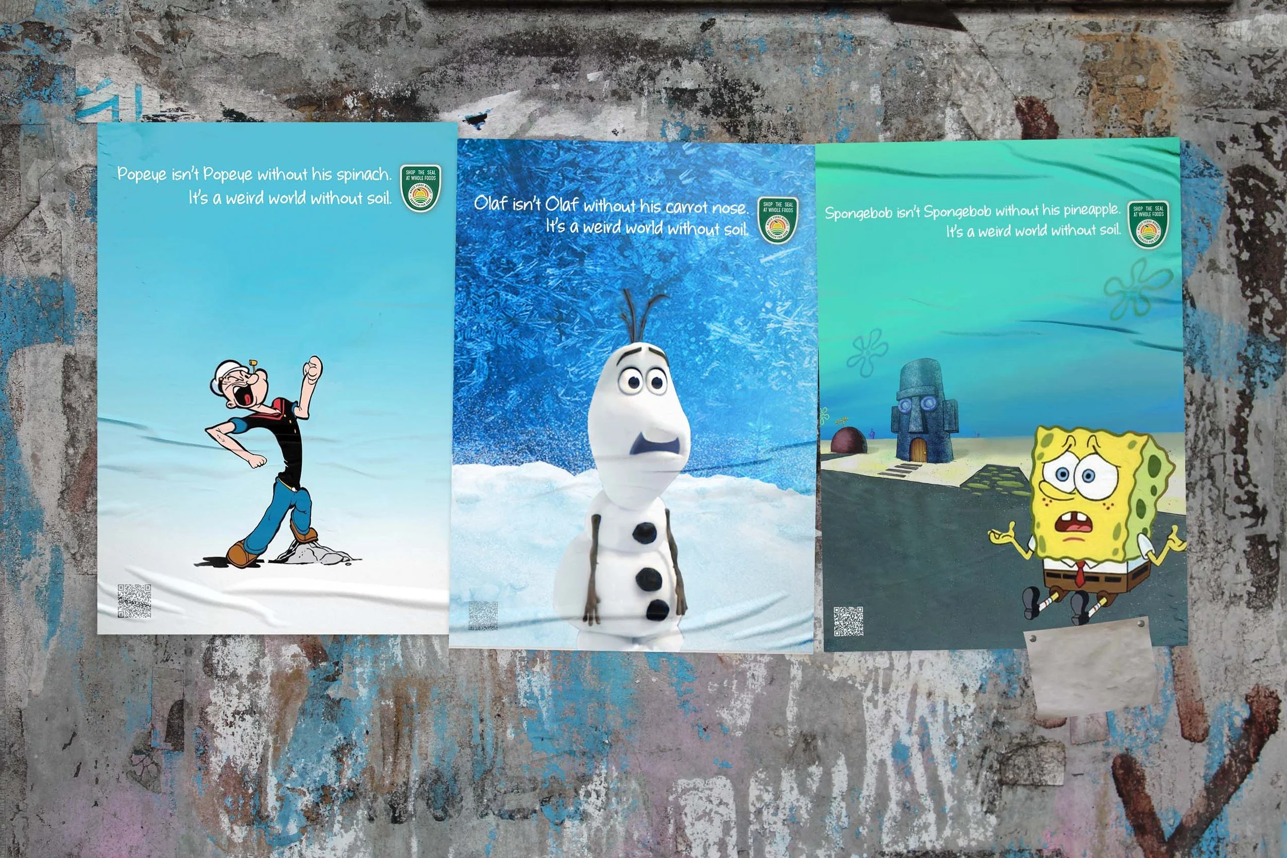 We realized that soil isn’t just an integral part of our diets, it’s woven into the characters we grew up on. In taking away their iconic produce we were able to show how weird the world is without soil.